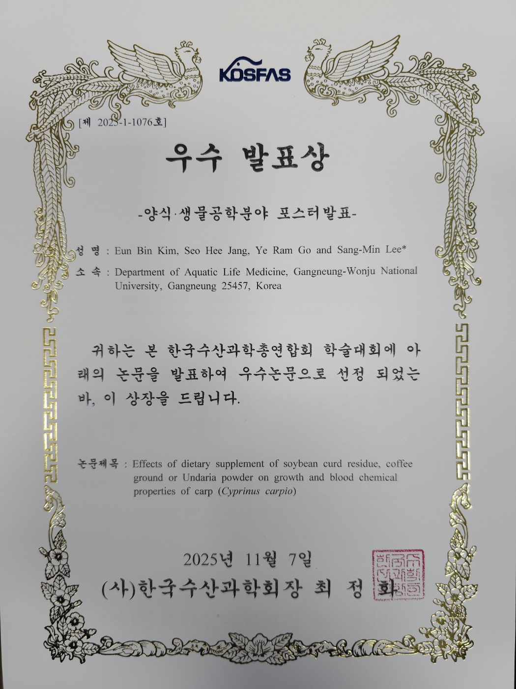 이번에 수상한 논문의 제목은 “Effects of dietary supplement of soybean curd residue, coffee ground or Undaria powder on growth and blood chemical properties or carp (Cyprinus carpio)”이며 수산생명의학과 이상민 교수의 지도로 연구를 수행했다.